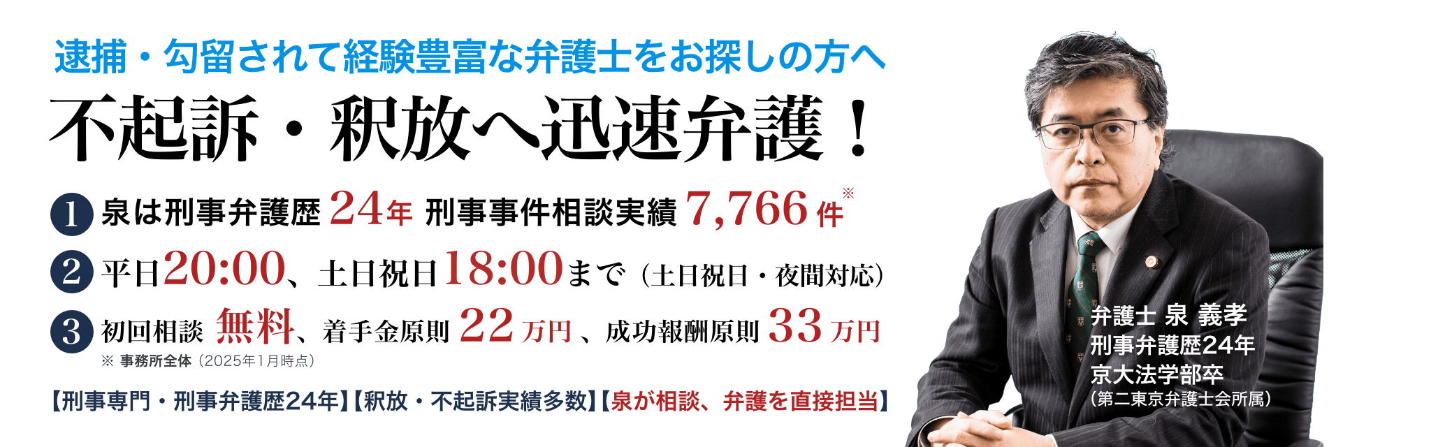 逮捕されたら「刑事弁護経験豊富で刑事専門※」泉総合へ!※但し、顧問業務取扱
